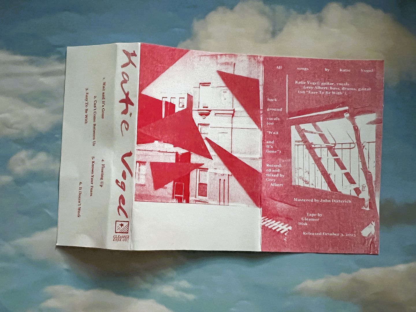 Katie Vogel's EP is the second release on cassette by Gleamer Disk. This release is different from the first because this EP is up and streaming on Bandcamp so you can hear it before getting a cassette, but that doesn't take away any of the importance of physical media. The EP is also $8 to download through Bandcamp digitally, so if you're the type who recognizes music that they like and thus likes to give the artists some money to keep them going, spending two more dollars (plus shipping) will get you the cassette.