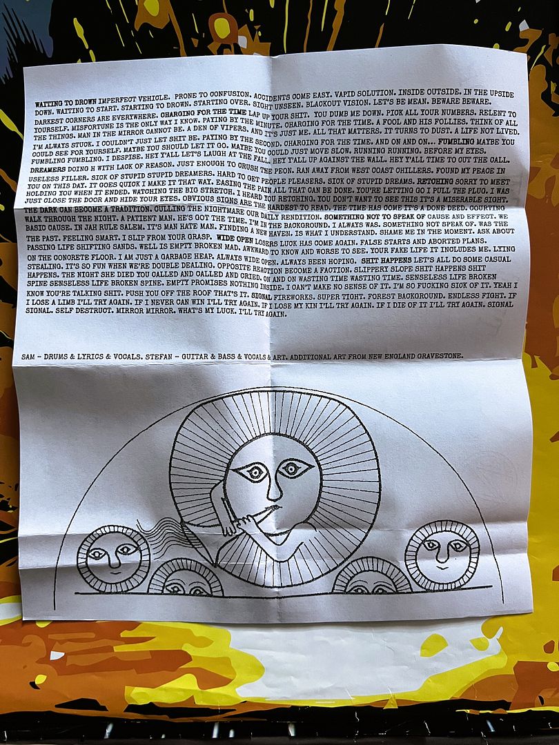 Big, crunchy gutiars take us into the second side. On "Something Not to Speak Of" they name drop New Haven, which is cool. There's a little bit of this interference in between that song and "Shit Happens", while "Shit Happens" is about exactly what you think it is. "Signal" ends this cassette with a bit more of a calmer, singing in monotone way. It almost feels like a chant, but it definitely has this way about it that it can get stuck in your head.